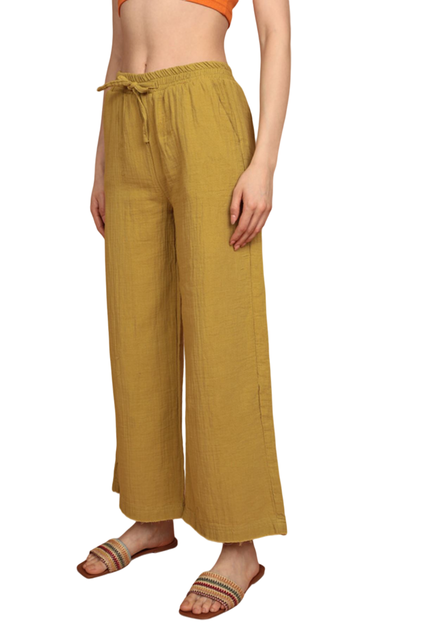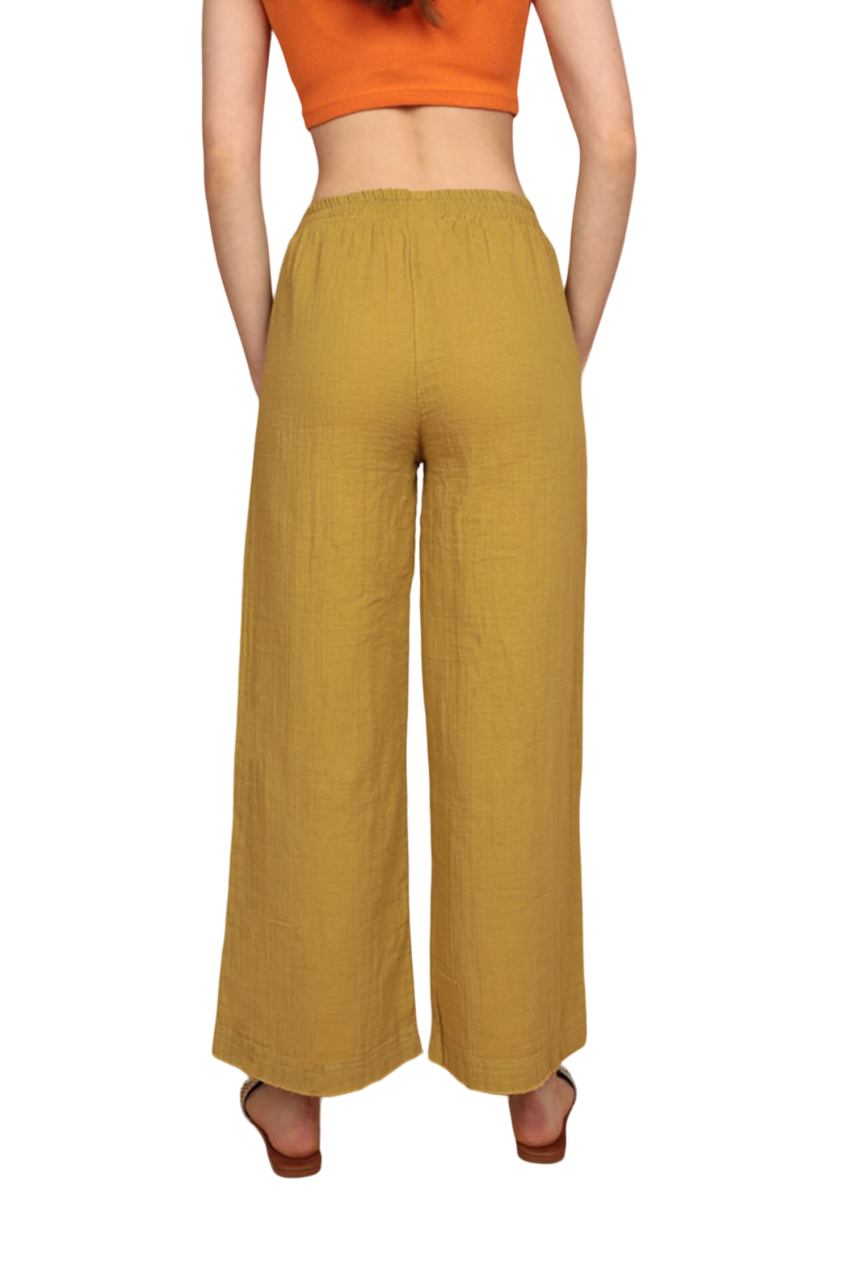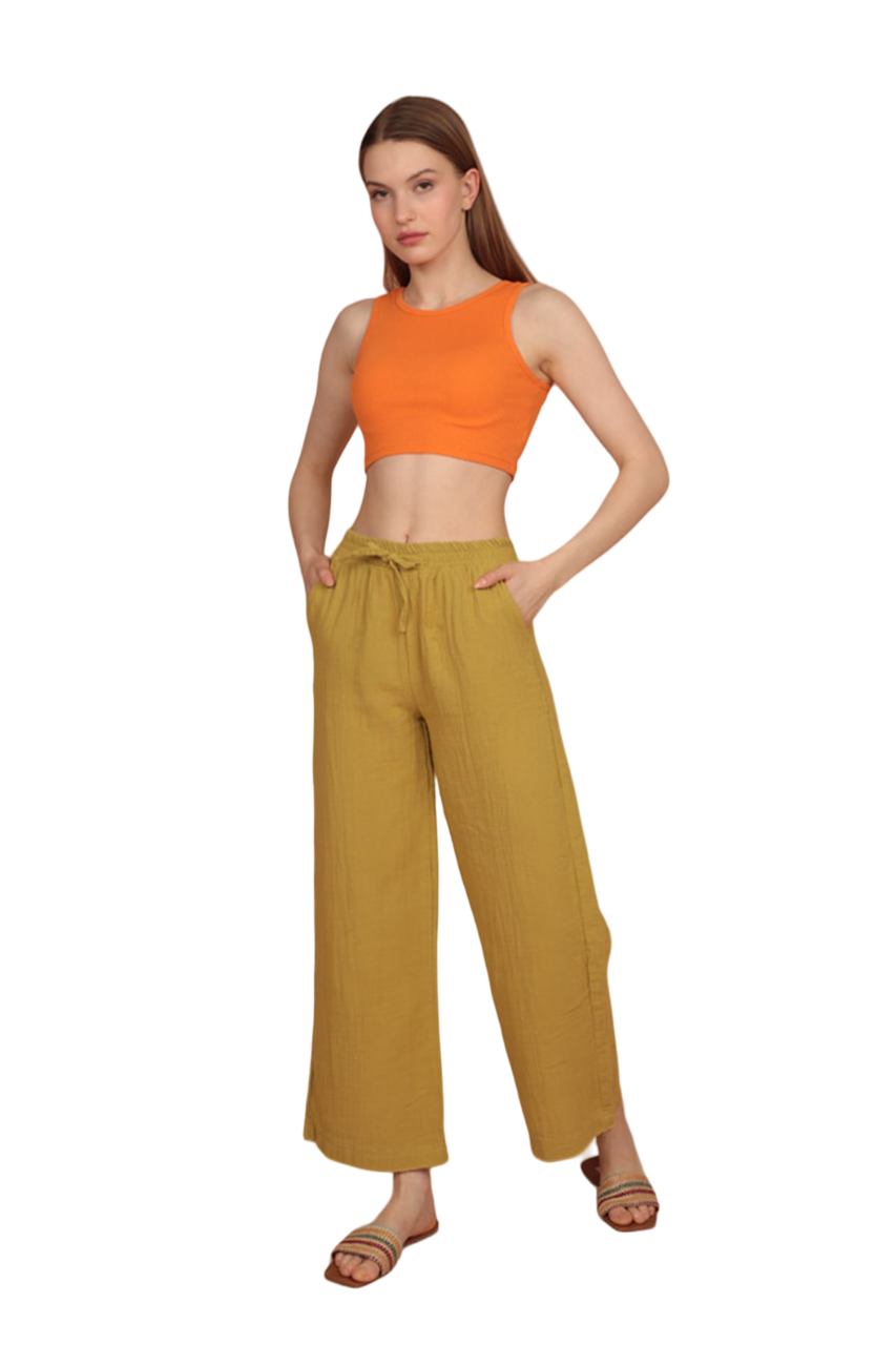 Muslin Fabric (%100 Cotton) Elastic Waist, Wide Leg Women’s Trousers – Oil Green